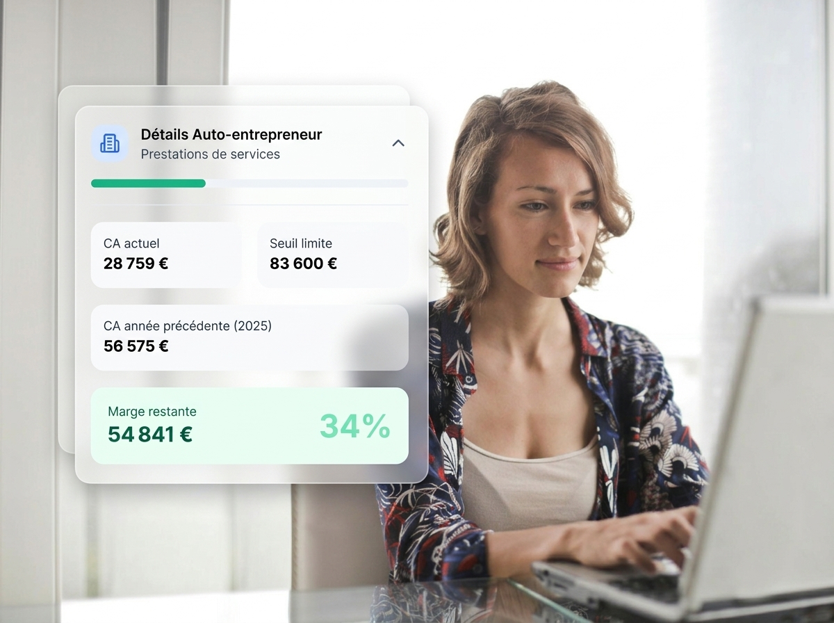 Avec ce module, gardez un œil précis sur votre position par rapport aux seuils clés de votre statut : éligibilité au régime auto-entreprise, TVA, et prélèvement forfaitaire libératoire. Des mises à jour en temps réel vous permettent de suivre votre activité sans stress.